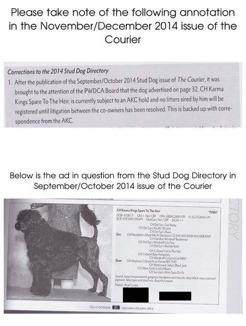 Mrs. Cunha has placed an advertisement in the PWDCA publication, The Courier, Stud Dog Issue (September/October 2014). She has offered at Stud, Karma Kings Spare to the Heir, a dog that I co-own. The dog is part of the on-going lawsuit (see list of dogs below). Correspondence from the AKC on November 20th, 2014 says in part the following: “The AKC will withhold registration of litters from the contested dogs until this matter is resolved.”